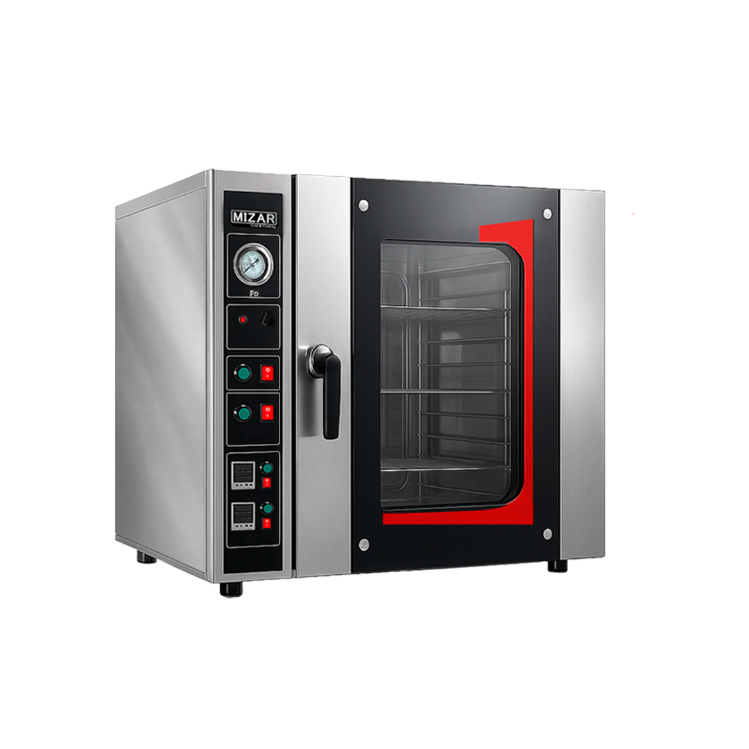 Incorpora sistema de aire caliente recirculable, que permite una cocción uniforme en todos los niveles. Dispone de capacidad para 5 bandejas de 400 × 600 mm, rango de temperatura de trabajo de 20 °C a 300 °C, termostato manual y dos temporizadores digitales para funciones de horneado y vaporización.